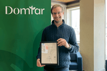 Jeffrey Byrns, ingénieur de procédés à l’usine Windsor, tient le nouveau certificat ISO 50001 de l’usine.