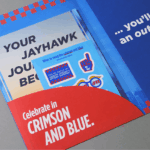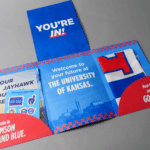 After doing quite a bit of research, they landed on the idea of a compelling experience of a folder that gradually unveils a story as it’s opened, revealing multiple components for the student along the way. Along with swag that included a flag and stickers, it contains a checklist of items students need to complete before starting classes at KU, plus their welcome letter/scholarship offer signed by Nick Stevens.