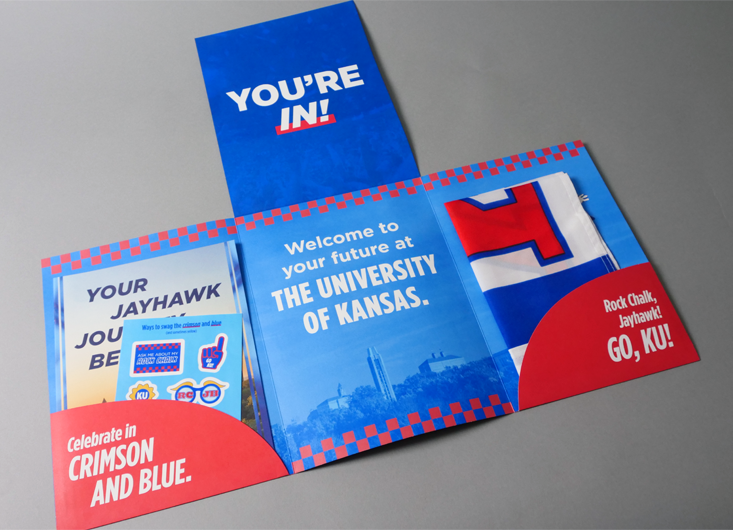 Admittance packets are a crucial building block in the relationship between university and student. It’s the congratulatory message from admissions to the student, the celebration of all their hard work. The accepted student has earned a “mailbox moment” and KU ensured that their delivery matched the recipient’s excitement.